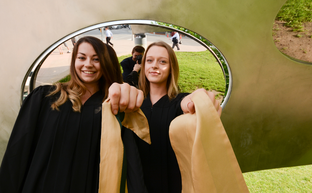 During the week, Durham College will be graduating approximately 3,500 students. Two of those graduates, Mackenzie Bolahood, left, and Sophie Turner, walked the stage and picked up their shiny, new diplomas on Monday, both of them graduating from the 911 Emergency and Call Centre Communications. (Photo by Joel Wittnebel).